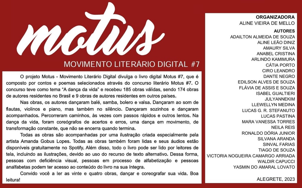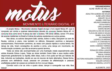 No MOTUS Movimento Literário Digital #7, que teve como tema: “A dança da vida", a poesia selecionada foi “A orquestra dos planetas". Está na página 17, da antologia, que foi publicada no formato digital.